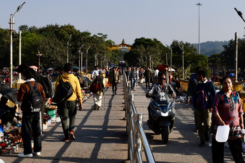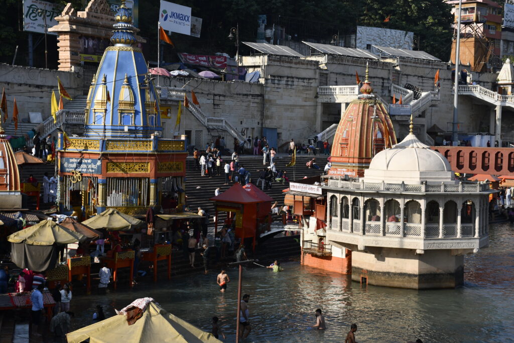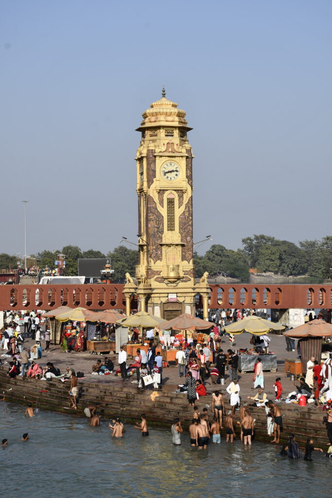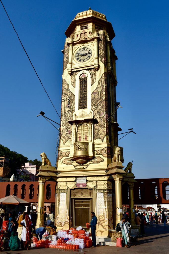 The Ganges runs quite fast here so there are metal railings along the riverbank to stop people being swept away whilst bathing. Also, a canal area has been built where the water is much calmer. There were many more people in the water here than in Varanasi and it had much more of a feeling of family fun. And also there was a golden clock tower! If you see orange water containers, I think they are sold to people who want to take Ganges water home.
