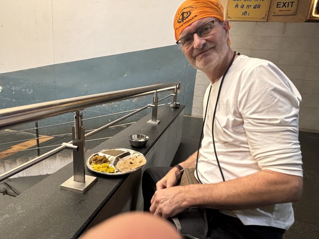 Anyone who visits The Golden Temple has an option to go and visit the food hall, where you can get a free veggie thali. Three types of curry, rice and a chapatti. And for people like me who bolt food down at pace, there was seconds. I’m not sure what I was expecting but there weren’t many westerners at the Golden Temple when we were there and we were easily singled out as people who needed direction. Where to stand, where to sit, where to eat. Strangely, we were also singled out as westerners or perhaps non-Sikhs so we had to eat on our own. As we left we saw the scale of volunteers, peeling potatoes and shelling peas. It was a large operation.